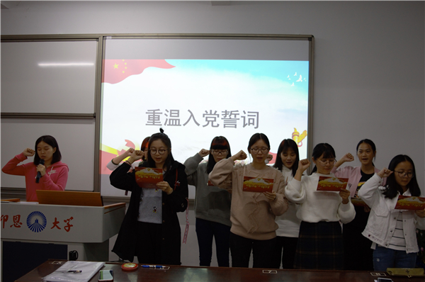 “我志愿加入中国共产党,拥护党的纲领,遵守党的章程,履行党员义务……”。11月28日晚,老金沙9170登录入口学生党支部在仰恩大学第三教学区普照教学楼202开展党员“政治生日”活动,阵阵铿锵有力的誓言从教室中传出,唤醒了党员入党时的追求与记忆。 活动中,全体党员重温入党誓词,在思想上再一次经受“洗礼”。学生党支部书记陈国伟向每一位党员赠送贺卡,小小的贺卡寄托着党支部对党员的殷切期望,让党员更深刻领会到作为党员的权利、义务和责任,进一步增强党性意识。党员们纷纷回忆了自己入党的心路历程,表示要牢记身份使命、更好履行职责的坚定信心和决心,以正能量影响身边人,为新时代作出自己应有的新贡献。 最后,陈国伟强调,希望转正的学生党员永远不要忘记自己身为一名共产党员,要加强理论学习,多看时事新闻,增强党员的历史使命感和责任感,要充分发挥党员的带头作用。 (老金沙9170登录入口学生党支部/文 康美燕/图)