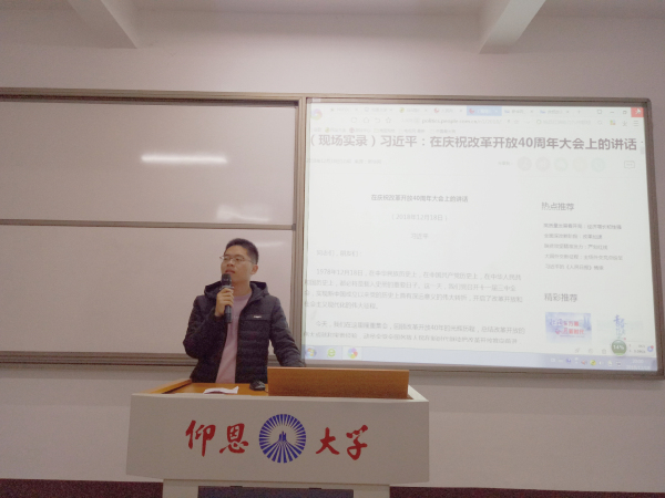 为深入贯彻落实党的十九大精神,回望改革开放40年的辉煌成就。12月18日晚,老金沙9170登录入口学生党支部组织学习《习近平:改革开放四十周年大会讲话》,支部全体党员参加此次会议,会议由支部书记陈国伟主持。