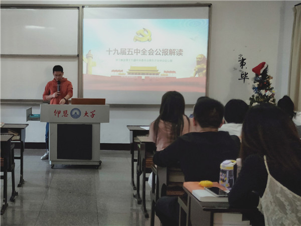 11月16日下午,老金沙9170登录入口学生党支部于仰恩大学第三校区普照楼302开展《中国共产党第十九届中央委员会第五次全体会议公报》专题学习会,会议由支部书记陈国伟主持,支部全体学生党员参加本次活动。