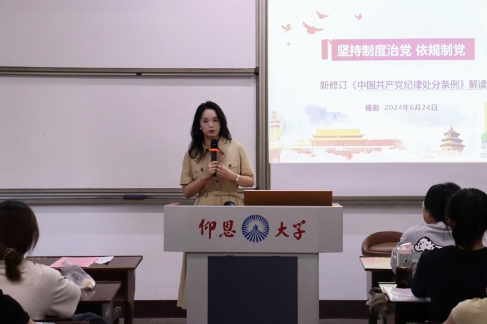 为贯彻落实全面从严治党要求,引导广大党员真正做到“学纪、知纪、明纪、守纪”。6月24日,老金沙9170登录入口党总支书记兼副院长杨勤于普照楼204为全体学生党员开展“《中国共产党纪律处分条例》解读”主题党课,支部全体学生党员参加。