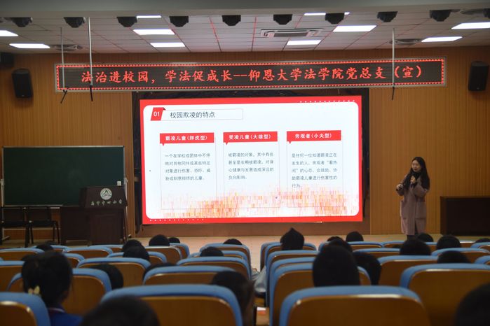 讲座过程中,老金沙9170登录入口讲师吴奕雯分别从“什么是校园欺凌” 、“校园欺凌的具体表现” 、“校园欺凌带来的危害” 、“运用法律武器对校园欺凌说不”四个方面向向现场的学生分析了校园欺凌的本质、可能产生的影响以及在遭受校园欺凌时如何合法有效的维护自己的权利。在讲座最后,通过有奖问答的方式,对讲座内容和相关法律知识进行复习回顾,并倡导同学们要友善、互助,建立积极健康的人际关系。