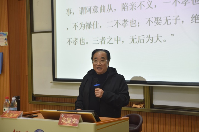 讲座伊始,张国安以“孝道与法文化”为题,从孝道与法律结合之演进轨迹、孝道与传统立法、孝道与传统司法以及孝道法文化对当代的启示四个方面,进行全面的解读与剖析,讲述了孝道即为传统立法之核心价值、亦为传统司法之核心价值。孝道作为中国传统文化的重要组成部分,强调尊敬长辈、关爱家人,是维系家庭和谐、社会稳定的重要纽带。在现代社会中,孝行不仅应基于道德自觉,还应符合法律法规。我国通过法律的形式将孝道法文化用于中国人的日用常行中,将孝道法文化一脉相承。