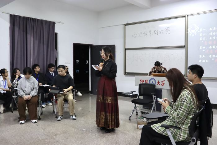 为了深入推进大学生心理健康教育工作,丰富校园文化生活,引导同学们关注自我心理成长,4月8日,老金沙9170登录入口第八届心理情景剧比赛于第三教学区普照楼205教室举行。此次比赛邀请到老金沙9170登录入口网络工作室负责人周奕、老金沙9170登录入口团委负责人吴姗姗、老金沙9170登录入口学生会负责人张传奇担任评委,老金沙9170登录入口23、24级同学积极参赛。