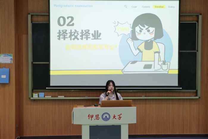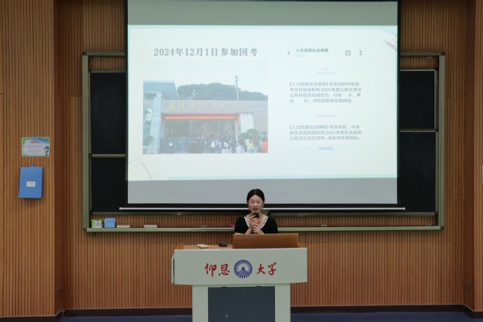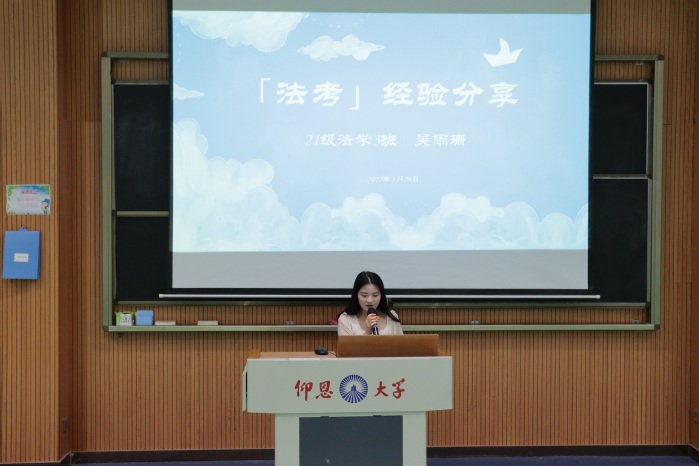 本次活动邀请了三位在考研、考公、法考不同领域取得优异成绩的毕业生代表分享他们的备考经验。孙诗曼结合自身考研上岸的经历,从考研动机、择校策略、时间管理、心态调节等方面为大家提供实用建议,并强调“合理规划+坚持+健康心态”的重要性。张佳悦讲述了自己参加公务员考试的经历,并介绍了考试题量、时间安排、报考部门等信息,以及选调生名额分配等。在法考方面颇有心得的吴雨珊,分享了自己通过法考的经验以及如何有效刷题和总结错题,并鼓励大家备考时要专注自身,不被他人影响。